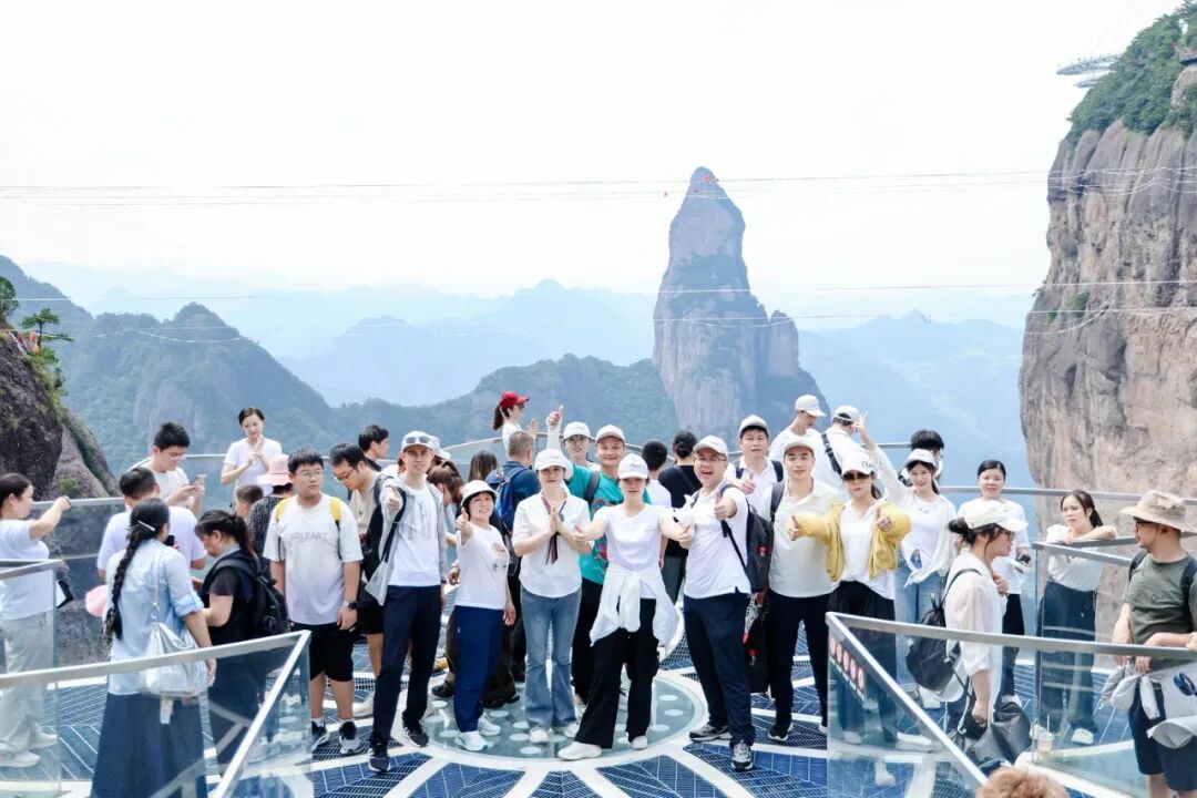 Upon arrival, the team first visited the popular suspended glass viewing platform. Standing a thousand meters above sea level, with steep cliffs beneath and rolling mountain ranges ahead, the gentle breeze created a sensation of touching the sky. Though some colleagues felt hesitant at first, encouraged by their peers, they courageously stepped onto the glass platform, capturing the stunning views with their phones. Cheers and exhilaration echoed through the valleys, melting away stress and tension in an instant.